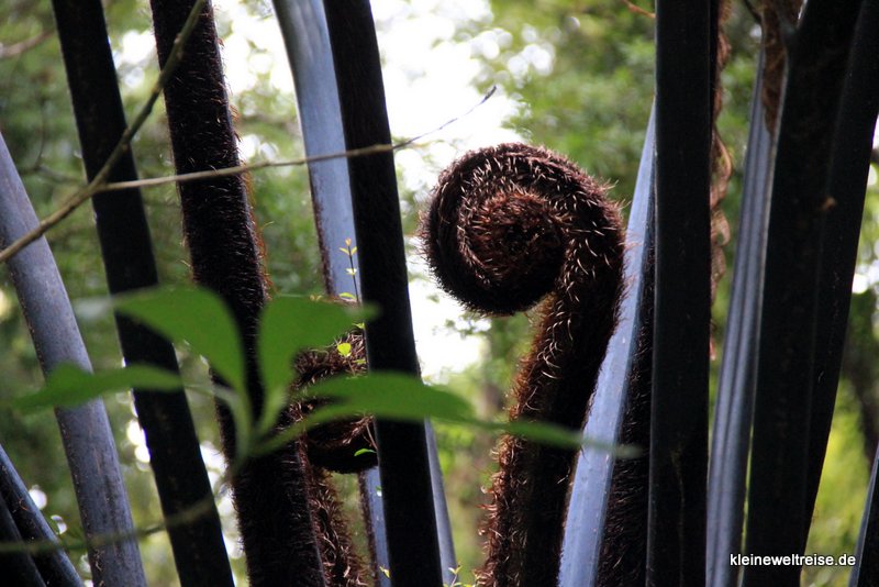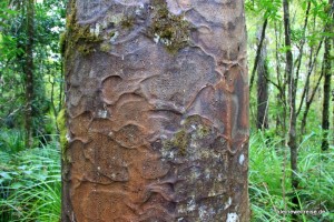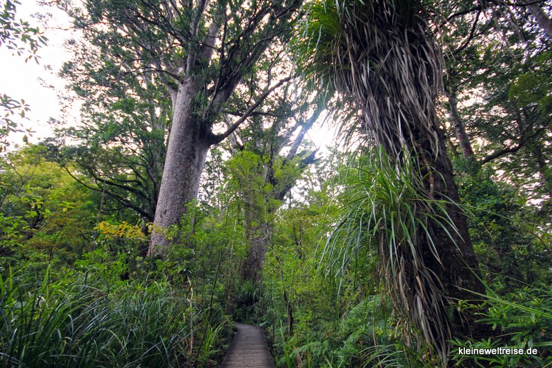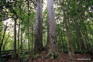 Im Wipua Forrest gibt es noch viele andere tolle Kauris, wie die Four Sisters oder Te Matua Ngahere (Father of the Forest). Weil die Wurzeln so unglaublich empfindlich sind, läuft man auf extra angelegten Holzstegen durch den Kauri-Wald. Übrigens, wenn man den Stamm anfasst, die Rinde fühlt sich ein wenig an wie Plastik.
