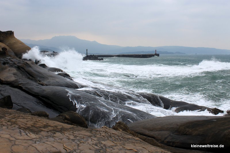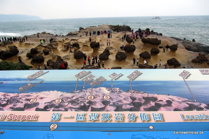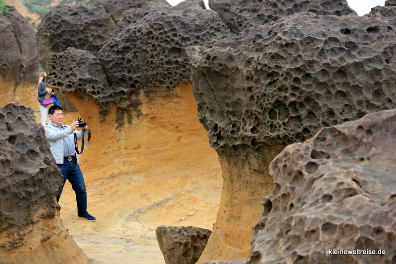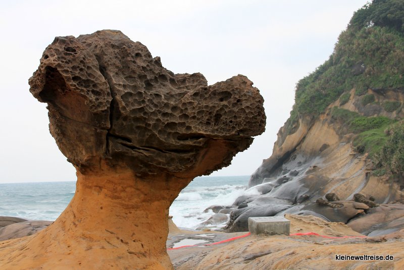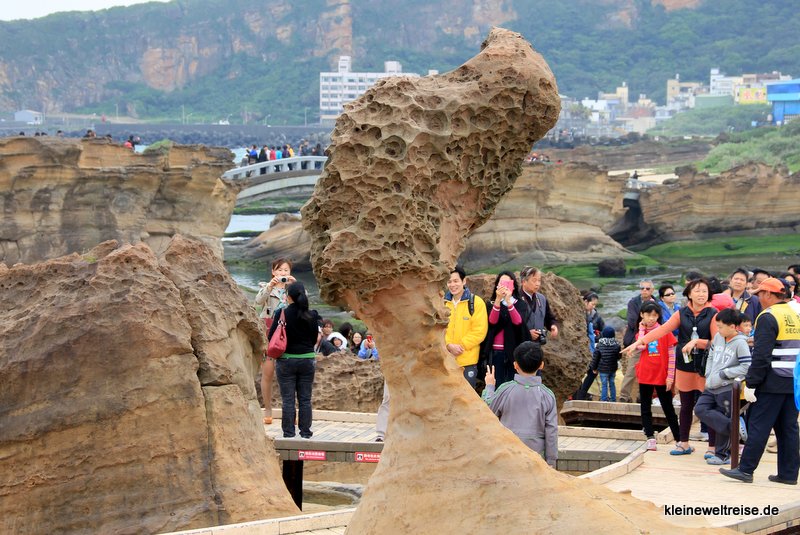 Die Pilze aus Fels hat das Meer gemacht. Sie stehen an der Nordspitze Taiwans, wo die See ziemlich rau werden kann. Nicht weit von Taipeh und Keelung entfernt, im Örtchen Wanli, liegt der Yehliu Geopark. Er ist eine sehr beliebte Attraktion. Denn die Taiwanesen lieben ihre Natur, besonders wenn sie so außergewöhnlich ist, man bequem mit dem Bus hinkommen kann und ein langes Ferienwochenende ist.