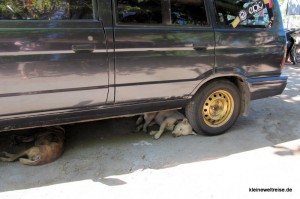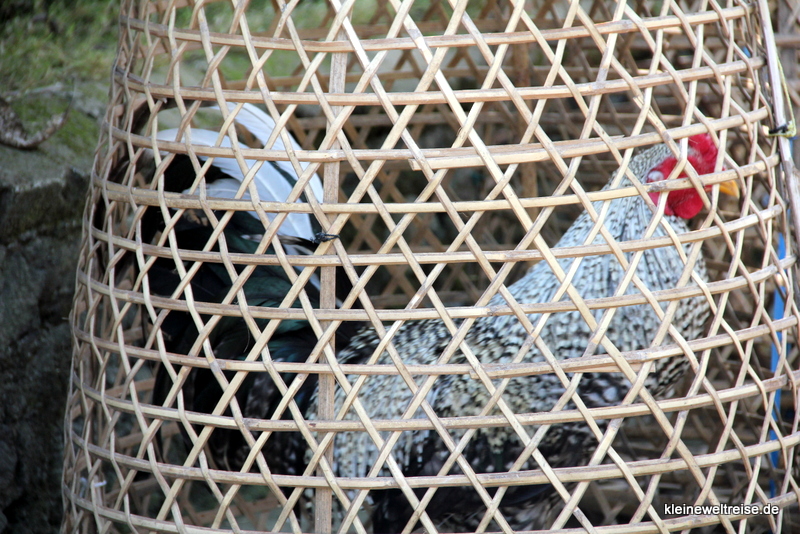 Außerdem findet man hier in fast jedem Ort oder am Straßenrand Hähne in Körben. Die sollen einmal gegeneinander kämpfen. Wir haben einmal einen Guide gefragt, was mit dem Verlierer passiere. Seine trockene Antwort mit einem Lachen war „It’s for eat!“