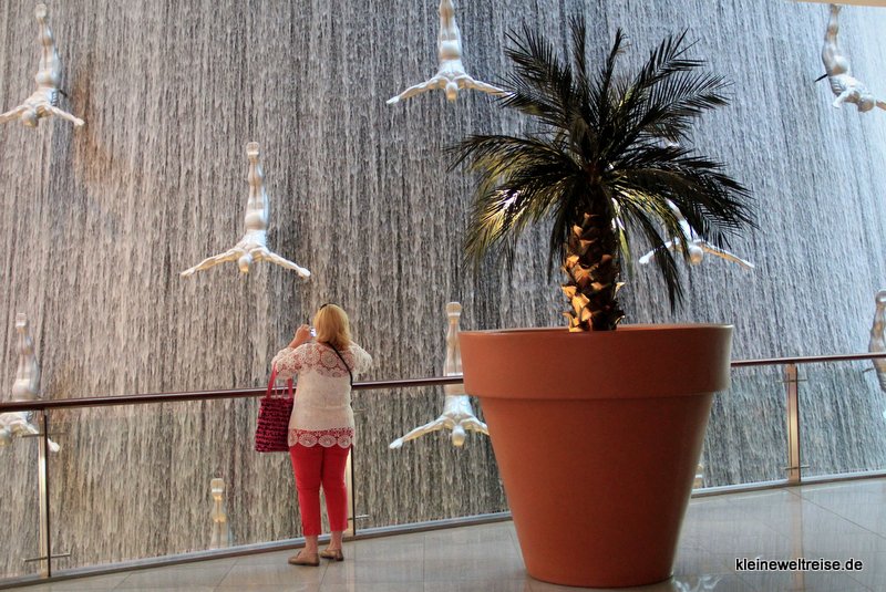 Nun gut, schlendern wir noch ein wenig durch die Dubai Mall und warten auf die Wasserspiele am Abend im großen Becken draußen vor der Mall. Springbrunnen zur Musik sind vielleicht ganz nett und wir sind ja schon mal hier. Als wir draußen stehen, kommt ein arabisches Lied und die Show geht los.