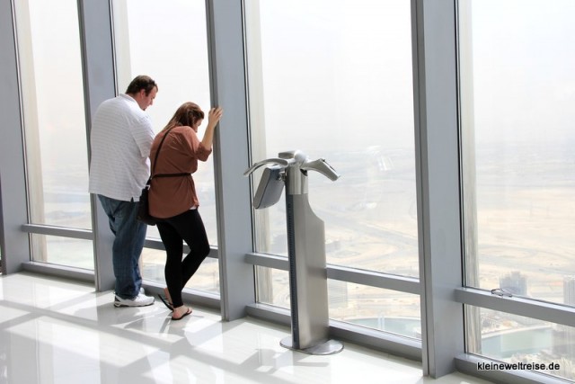 Am nächsten Vormittag ist es soweit, wir haben unsere Tickets und stellen uns in die Schlange. Dann Sicherheitskontrolle, lange Gänge und Rolltreppen, noch eine Schlange und schließlich der superschnelle Aufzug zur Aussichtsplattform des höchsten Gebäudes der Welt (828 Meter).