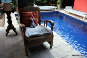 Pool im Hotel von SanurDürfen wir Fanta vorstellen? Fanta ist ein kleiner Sockenpuppen-Elefant. Er ist unglaublich neugierig und mit seinem wachen rechten Auge sieht er alles. Er begleitet uns auf unserer Reise, denn auch er möchte die Welt entdecken.