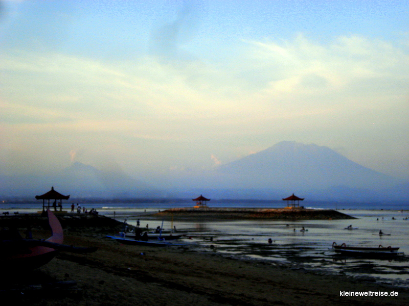 Sanur Strand mit VukanDer Strand ist der Treffpunkt für alle – Touristen und Balinesen. Am Sonntag haben die Einheimischen hier ihre Picknicks mit Grill und Großfamilie veranstaltet und die kleinen Balinesen ihre Drachen steigen lassen. Ebbe und Flut sind hier stark ausgeprägt. Unser Timing hat uns immer zur Ebbe an den Strand geführt, dann, wenn die Fischer im Meer stehen und auf Fang gehen. Der Strand ist endlos lang, von Schirmen und Palmen gesäumt. Am Horizont sind leicht die beiden großen Vulkane Balis sichtbar – die müssen sehr sehr hoch sein.