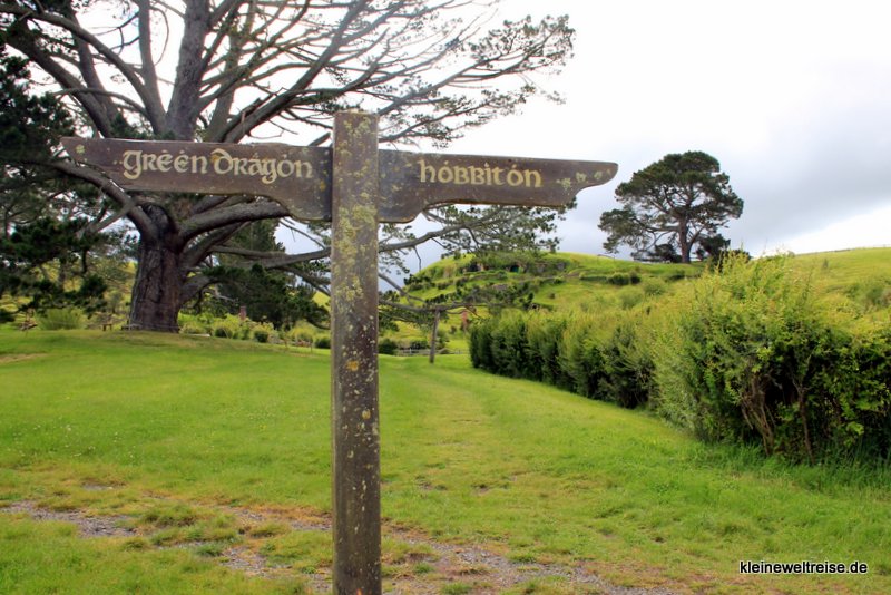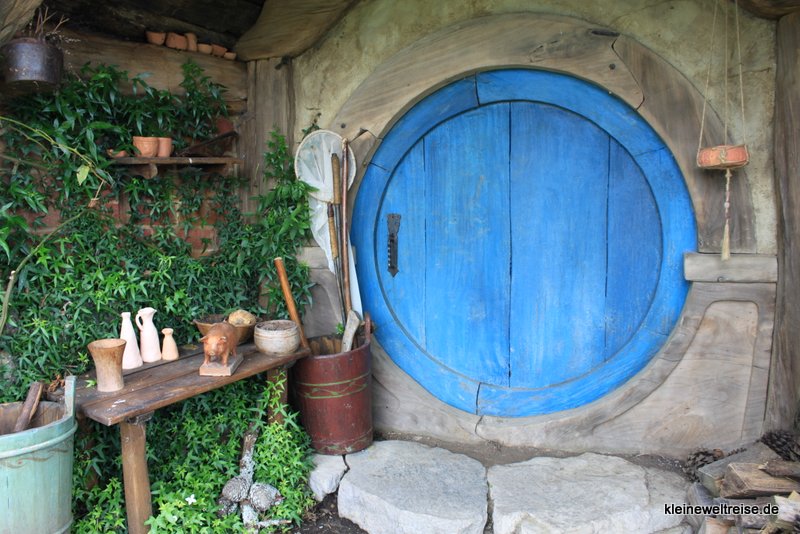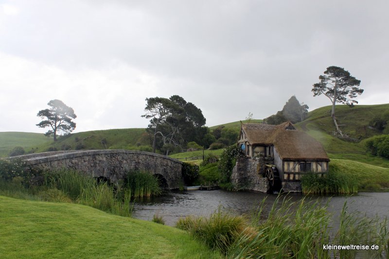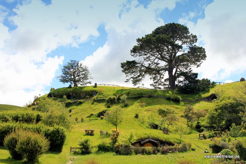 das Auenland (die Alexander-Farm)Fanta vor einem Hobbit-HeimHobbiton im Hügelalles in Miniatur im Vorgartenhier hinter der grünen Tür wohnt Bilbo Beutlinder Party-Treedie Mühle und die Brücke bei Regenda langDie Legende geht so: Als Peter Jackson aus seinem Luftfahrzeug die Farm der Familie Alexander sah, hatte er Hobbiton gefunden. Die neuseeländische Armee kam und baute ein paar Kilometer Straße, dann baute das Filmteam Hobbiton in einen Hügel, sowie die Mühle und den Green Dragon Pub. Als sie den „Herrn der Ringe“ fertig gedreht hatten, wurde die ganze Pappkulisse eingerissen. Kleine Reste von Hobbiton blieben stehen, weil das Wetter schlechter wurde und die Abrissarbeiten stoppte. Als das Wetter wieder besser wurde, und die Filmfirma weiter abreißen lassen wollte, war der Hügel auf der Farm bereits zur Pilgerstätte von Lord of the Ring Fans geworden. 2011 wurde Hobbiton wieder komplett aufgebaut, Peter Jackson kam zurück und die Hobbit-Trilogie wurde gedreht.