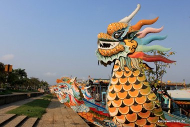 Der Bootsanleger an der Thien Mu Pagoda war gerappelt voll mit Drachenbooten. Ebenso beliebt war die Pagode, im Inneren gaben sich hochinteressierten Besuchergruppen die Klinke in die Hand. Wir hängten uns die Kamera um, setzten den Sonnenhut auf (es wurde so langsam heiß) und reihten uns ein. Im Kloster sahen wir übrigens eine ungewöhnliche Sehenswürdigkeit: Den alten Austin, in dem sich der Mönch Thích Quảng Đức 1963 auf eine Kreuzung in Saigon fahren ließ, um sich aus Protest gegen die Unterdrückung des Buddhismus selber zu verbrennen.