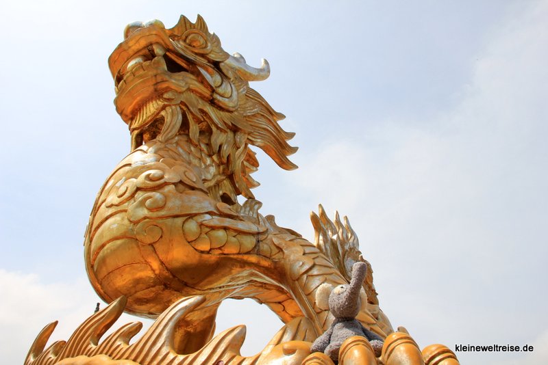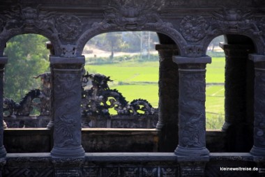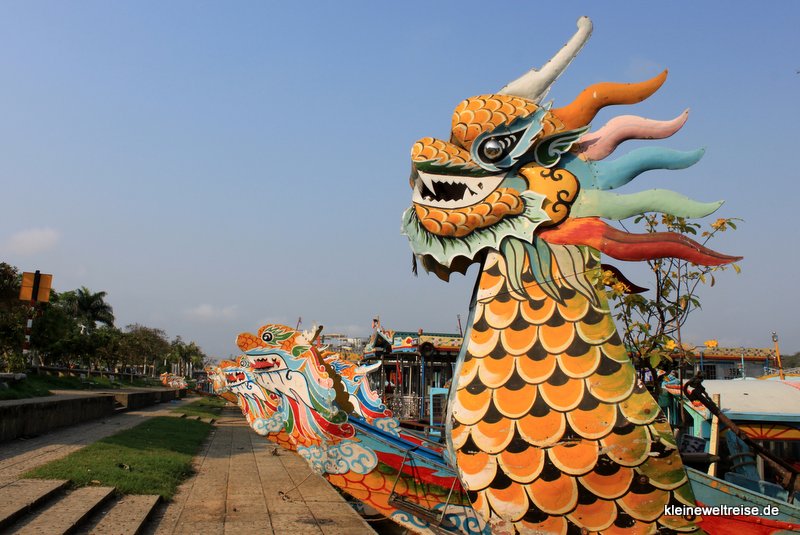 Auf dem Parfümfluss (der heißt wirklich so) nahmen wir eines der bunten Drachenboote. Es sollte uns zu den Sehenswürdigkeiten außerhalb von Huế schippern. Die Familie, die das Boot betrieb, hatte ihr Business komplett durchoptimiert: Der obligatorische Verkaufstisch mit Souvenirs war immer sichtbar platziert. Das Mittagessen: Ob wir nicht etwas anderes als das im Preis enthaltene bestellen wollten? Sei ja nur Tofu mit Bohnen. Alles klar, bitte einmal Rindfleisch mit Gemüse zum „good price“ für uns. Hätten wir aber nicht bestellen müssen, es war kalt, zäh und sehnig.