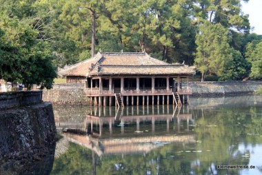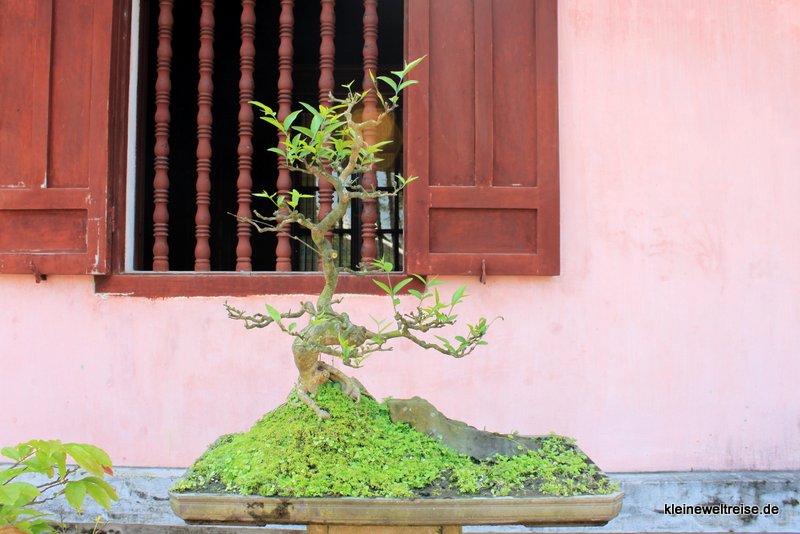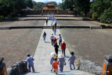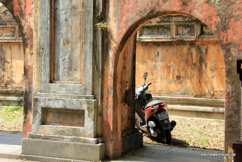 Gebaut wurde die Zitadelle nach dem Vorbild der Verbotenen Stadt in Peking, denn früher war Huế die Stadt der Kaiser. Heute zählt sie zum UNESCO Weltkulturerbe. Ein Teil der Gebäude wurde bereits restauriert und sah schön neu und bunt aus, ein anderer Teil war noch kaputt und verfallen. Zwei Rentner aus Süddeutschland, gut zu erkennen am knall-orangenen Stefan Loose Reiseführer unterm Arm, geben uns den Tipp die Südwestecke anzuschauen. Denn die wäre am schönsten.