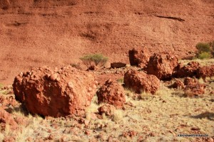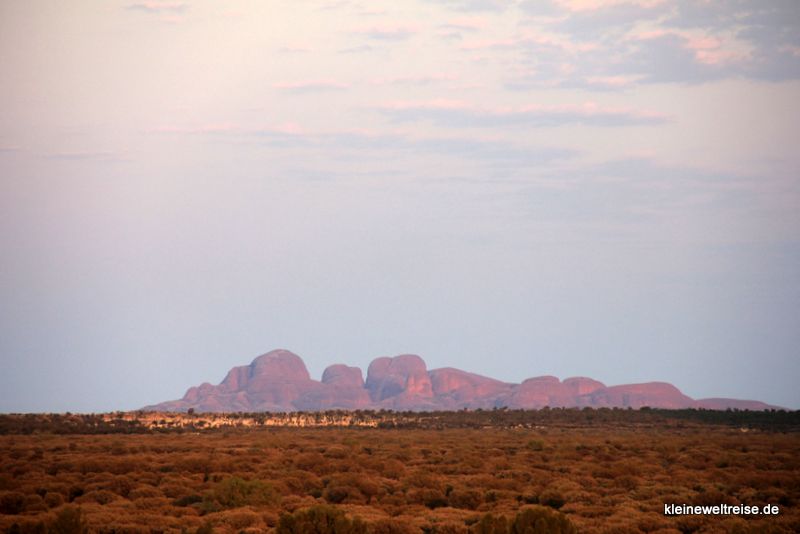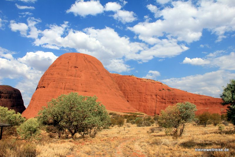 Die Gruppe kuppelförmiger Felsen steht gar nicht weit vom Uluru entfernt. Die riesengroßen roten Steine werden beeindruckender mit jedem Meter den man sich ihnen nähert.
