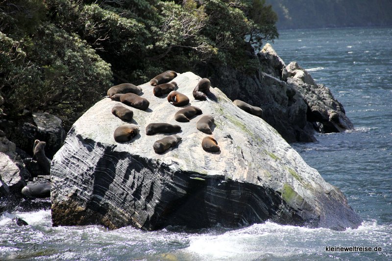 Im weiteren Verlauf der Tour steuerte der Captain für uns noch zwei weitere Highlights des Milford Sounds an. Das erste war ein Felsen voller Robben. Nur bei Flut kommen die Tiere hinauf, und legen sich in die Sonne. Zweites Highlight war ein großer Wasserfall, auf den wir zusteuerten. Immer näher kam das Spritzwasser, der Wind trug den Sprühnebel über das Deck. Bis wenige Zentimeter an den Wasserfall heran brachte uns das Boot, zum Greifen nah. Wir hätten problemlos unsere Trinkflaschen auffüllen können, hätten wir sie nur griffbereit gehabt. So sind wir nur nass geworden. Passenderweise war es am Wasserfall 12:12 Uhr am 12.12.2012.