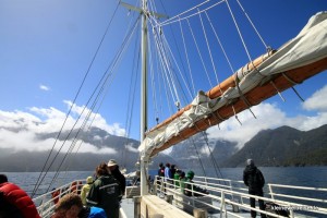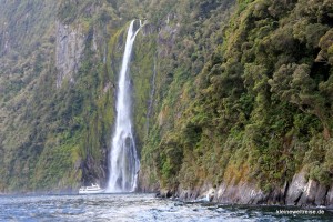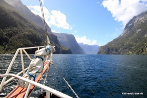 In Milford angekommen lag unser Schiff, die Milford Wanderer, fertig zum Ablegen am Pier. Die meisten Leute, die sich auf die Fahrt über die Berge gemacht haben oder sogar hierher gewandert waren über den Milford Track, gönnen sich eine Bootsfahrt. So auch wir, denn den 15 Kilometer langen Fjord mit seinen steilen Bergen und Hängen wollten wir unbedingt erleben!