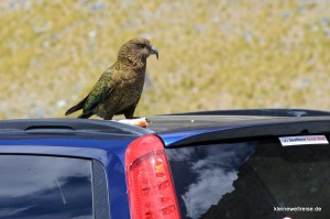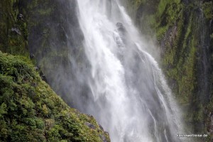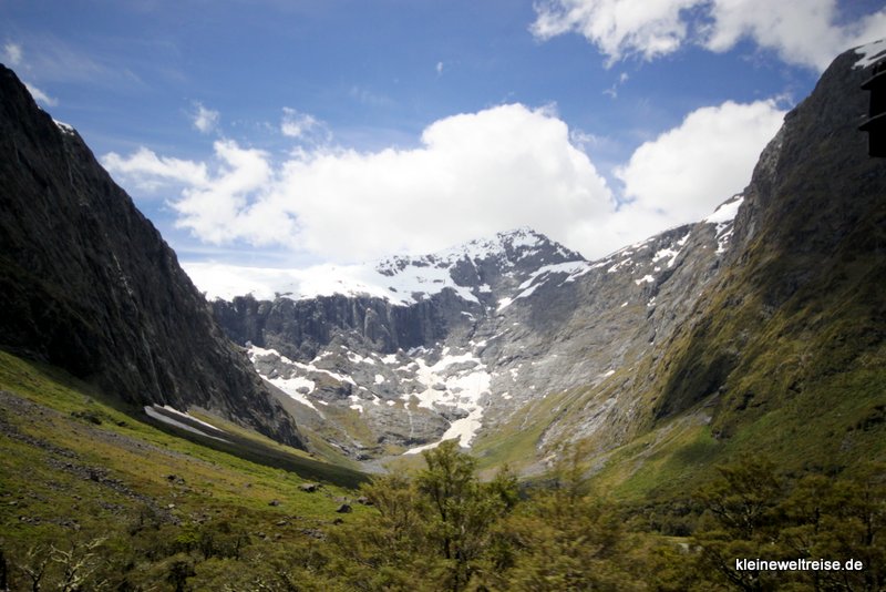 Wir fuhren gerade mit dem Bus durch die Südalpen zum Milford Sound, als der Busfahrer das gute Wetter bedauerte. Links und rechts von uns steile Felshänge von denen Wasserfälle herunterliefen, immer mal wieder unterbrochen von grandiosen Aussichten durch die Berge. Es war eine gute Wahl gewesen, die Milford Road nicht selber mit dem Wohnmobil zu fahren, sondern von Te Anau den Bus zu nehmen. So konnten wir die 120 Kilometer einfach aus dem Fenster schauen und staunen.
