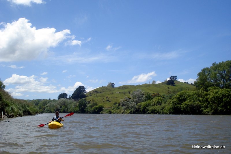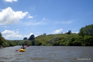 André vom Top 10 Holiday Park in Wanganui hat uns den Ausflug schmackhaft gemacht: „Macht es so, ich setze Euch fünf Kilometer flussaufwärts ab, dann könnt Ihr mit der Strömung gemütlich hier runter paddeln. Dann seht Ihr auch mehr.“