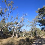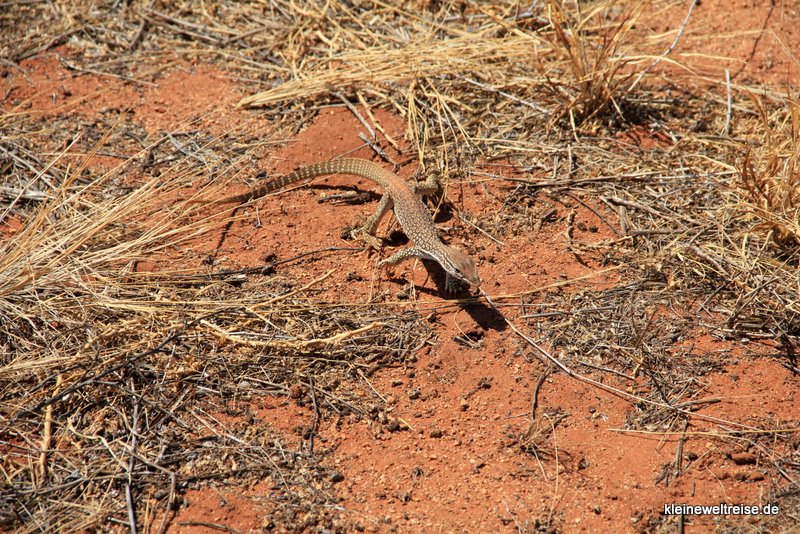 Die rote Erde des Kontinents kommt immer wieder durch, an wenigen Stellen so extrem wie im Outback. Darauf erst auf den zweiten Blick sichtbar eine Eidechse. Eidechsen haben wir viele gesehen, sie sonnen sich gern auf den warmen roten Steinen.