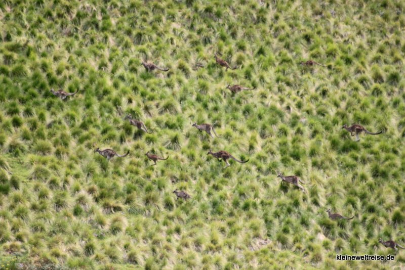 Grüne Wiesen und Hänge haben wir zuhauf gesehen. Manchmal wirkte Australien fast wie Irland oder der Odenwald. Auf dem grasbewachsenen Hang eines Kraters hoppelt eine Herde Kängurus um ein paar Meter weiter zu grasen. Wenn sie alle gemeinsam hüpfen wirken die Kängurus wie die Herde Velociraptoren aus Jurassic Park. Zufall?!