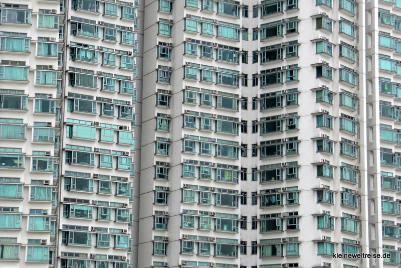 Wohnblöcke. Alles voll mit Wohnblöcken. Und hoch sind sie, weil der Platz in Hongkong begrenzt ist und viele viele Menschen hier auf engstem Raum leben (müssen). Und das sieht man halt an den Wohnungen, die sie bauen.
