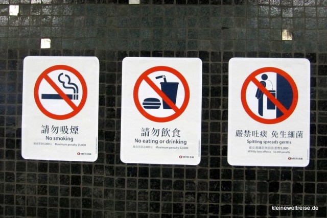 Wo viele Menschen zusammen kommen, muss es Regeln geben, ganz klar. Und selbstverständlich auch Anreize zu ihrer Einhaltung. So kostet Spucken schon mal 5.000 HKD oder Rauchen bis zu 55.000 HKD (ca. 5.500 EUR). Damit alle Bescheid wissen, werden gut verständliche Verbotsschilder aufgestellt.