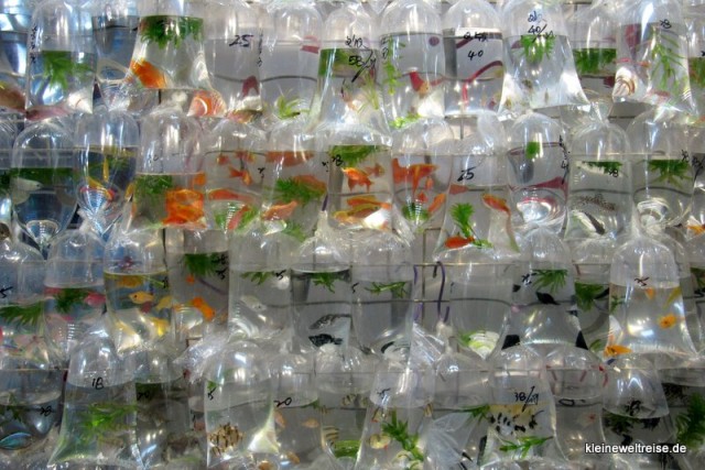 Die Aquariengeschäfte in Mong Kok waren außergewöhnlich: Ganze Wände hingen voll mit Zierfischen in Tüten, jeweils einzeln verpackt. Einfach hingehen, in den Korb legen und kaufen, schon gehört der Fisch Dir.