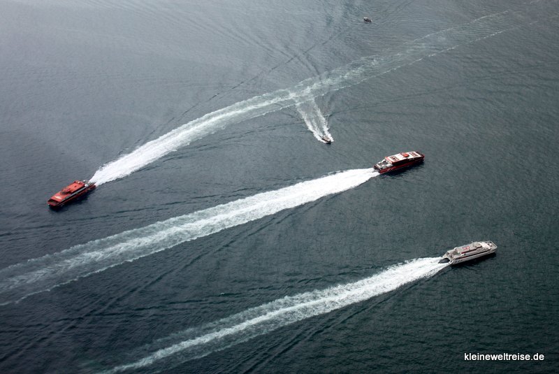 Mitten in Hongkong liegt das Wasser des Victoria Harbour und teilt die Stadt. Außerdem gehören zu Hongkong ein paar Inseln, wie Lantau oder Lamma. Wenn man von oben auf den Hafen schaut, sieht man zahlreiche Schnellboote und Passgierfähren durch das Wasser pflügen, die die Pendler in die City und wieder zurück bringen.