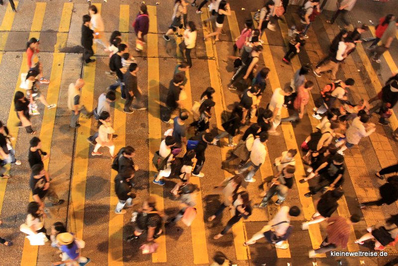 Ähnlich wie in den Wohnsiedlungen sieht es auch auf den Straßen aus, vor allem im Zentrum: Viele Menschen. Besonders ab 17 Uhr, wenn alle aus den Büros kommen, wird es in Central busy. Wer nicht über die zahlreichen Fußgängerbrücken geht, nimmt den Zebrastreifen.