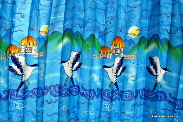 In jedem laotischen Bus gibt es Vorhänge für Nachtfahrten oder als Sonnenschutz. Egal wie alt der Bus oder wie abgegriffen der Vorhang war, immer hatten die Gardinen das gleiche Muster: Blau mit Landschaft und Vögeln.