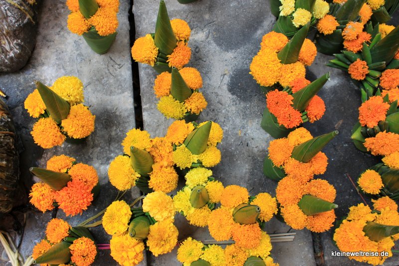 Laos ist sehr buddhistisch. In den Tempel oder an den Altar werden gern Spenden mitgebracht. Wie diese orangenen Blumen.