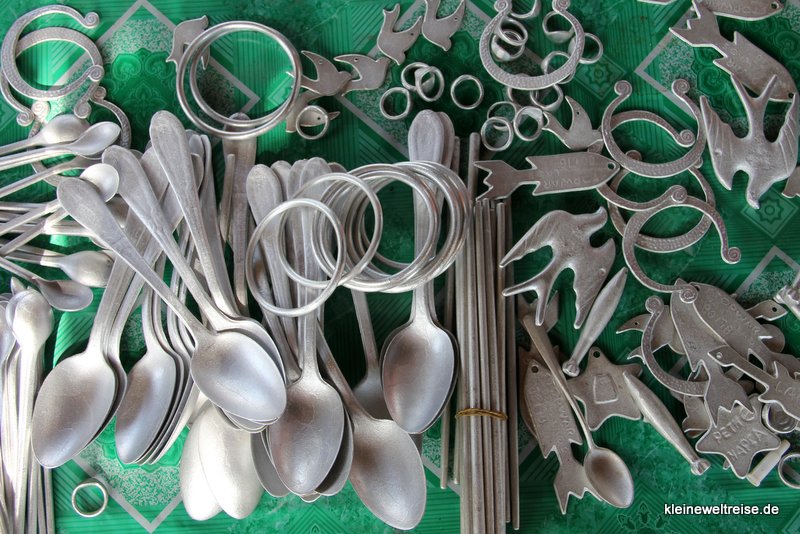 Die Alu-Löffel sind uns in Phonsavan und Umgebung oft begegnet. Manchmal begleitet vom Slogan „Make spoons not war.“ Ursprünglich wurden diese Löffel, Chop-Sticks und kleinen Friedenstauben aus dem Metall der Bombenhüllen gemacht, die über Laos niedergegangen sind. Heute „mischt“ man das Metall der Bombenhüllen mit Metall von LKWs, nur so lässt sich die Nachfrage befriedigen.