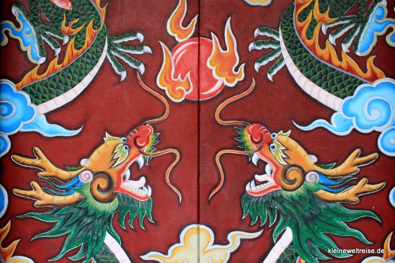 In Tempeln oder Palästen liebt man es neu und gerne farbenfroh. Und ganz wichtig in Vietnam: der Drache, denn er steht für Geld und Wohlstand. So haben wir diesen gemalten Drachen auf einer Tür in einem Tempel in Hoi An gefunden.
