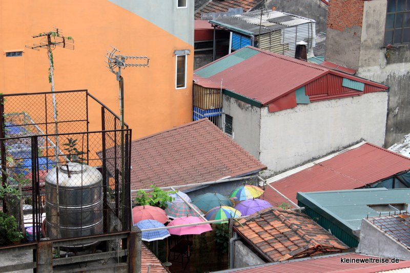 Die Häuser in Vietnam sind eng gebaut, ganz besonders in Hanois Altstadt. Einer kurzen Straßenfront folgen oftmals ein über 100 Meter tiefes Haus oder viele Hinterhäuser. Von oben ein riesiges Dächermeer, fast ganz ohne Straßen.