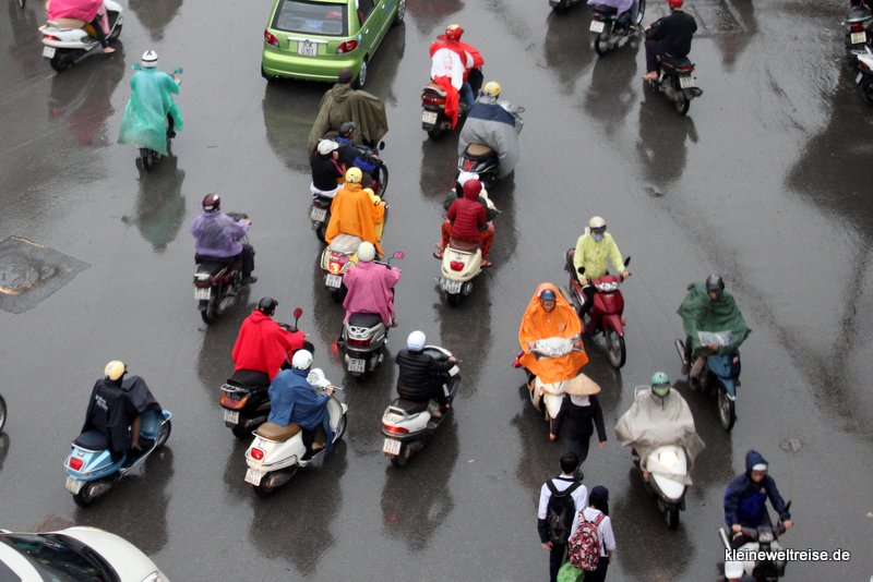 Wie unzählige kleine wuselige Käfer sausen die Autos, Mopeds und Cyclos umeinander her. So sieht der Verkehr in einer vietnamesischen Stadt von oben aus. Die Fahrweise wirkt komplett improvisiert und freestyle-mäßig. Dennoch scheint es halbwegs zu funktionieren. Auch bei Regen, da ziehen alle nur ein Plastik-Cape über. Gefahren wird wie immer.