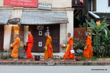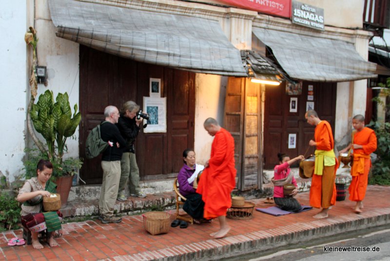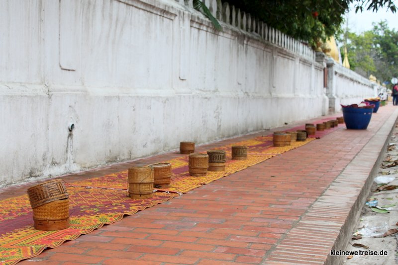Als wir an diesem frühen Morgen durch die Straßen der kleinen Stadt in Laos liefen, waren bereits Teppiche mit Sitzkissen und Reisschalen für Touristen aufgebaut. Die Touristen teilten sich dann in zwei Gruppierungen: Diejenigen, die den Mönchen etwas zu essen gaben (meist vom Straßenhändler), und diejenigen die fotografierten.