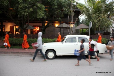 Ein bisschen Tradition haben wir in dem ganzen Trubel dennoch gefunden. Hunde liefen neben der Prozession her, immer wachsam, ob nicht vielleicht doch ein Happen auf den Boden fällt. Kinder saßen am Straßenrand und bettelten, die Mönche wiederum gaben den Kindern von ihrem Reis ab, wenn sie zu viel hatten. Viele Besucher haben zwar der Prozession beigewohnt, aber einfach ein bisschen Abstand gehalten. Schön war’s dann doch ein bisschen. Vielleicht hat diese Prozession der Mönche am frühen Morgen in Luang Prabang doch eine Chance, noch lange lange zu bestehen.