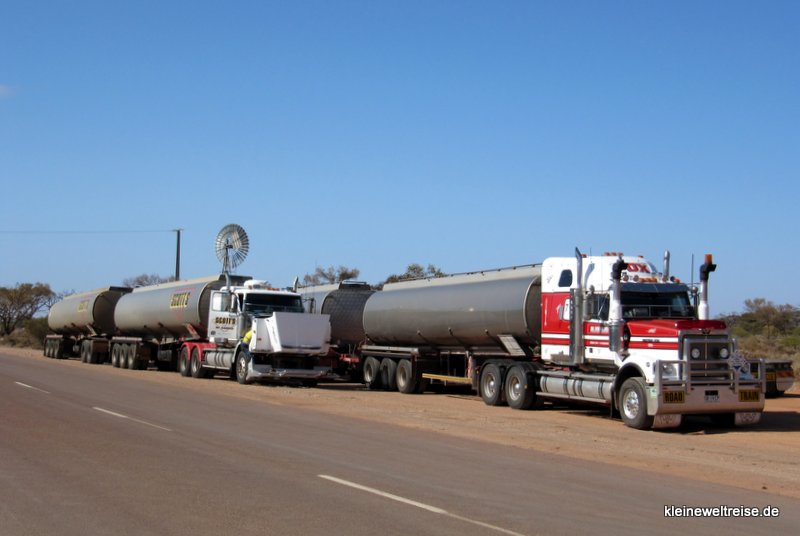 Die Road Trains sind eine Spezialität des Outbacks. Da der Verkehr sehr gering ist, sind LKWs oft mit zwei oder noch mehr großen und schweren Anhängern unterwegs. Sie dürfen allerdings die Länge von 53 Metern nicht überschreiten. Immer wenn uns so ein Koloss entgegen kommt, wackelt unser Bus ein bisschen.