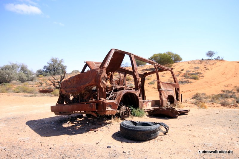 Hier im Outback sieht man am Straßenrand ziemlich oft Autowracks. Ausgeschlachtet und verrostet verfallen sie abseits des Highways. Wenn man hier draußen eine Autopanne hat und sein Fahrzeug nicht mehr flott kriegt, lohnt sich das Abschleppen nur bei teuren Fahrzeugen. Ansonsten übersteigen die Abschleppkosten leicht den Wert des Wagens. Also überlassen viele Leute ihre kaputten Autos einfach dem Outback.