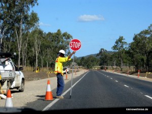 Eine Sache in Australien mussten wir schmerzhaft lernen. Wenn der Routenplaner oder ein Australier sagt, die Fahrt würde 3 Stunden dauern – rechne immer mit 4 oder 5 Stunden. Wie habe ich die deutsche Autobahn vermisst. Der Highway ist zweispurig, also nur eine Spur pro Richtung. Das Tempolimit bei maximal 100 km/h. Und eine Baustelle jagt die nächste. Baustelle in Australien bedeutet: Es steht jemand mit einem Stoppschild auf der Straße und man muss zwischen 5 und 20 Minuten warten, bis man weiterfahren darf. Und da die Stoppschild-Halter aufeinander folgen, lernt man auf australischen Highways seinen inneren Buddha sehr sehr gut kennen.