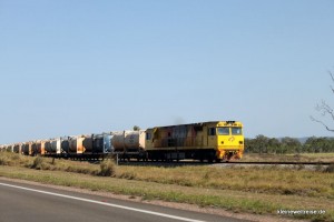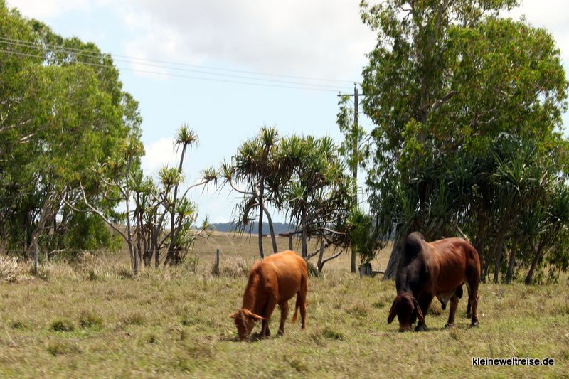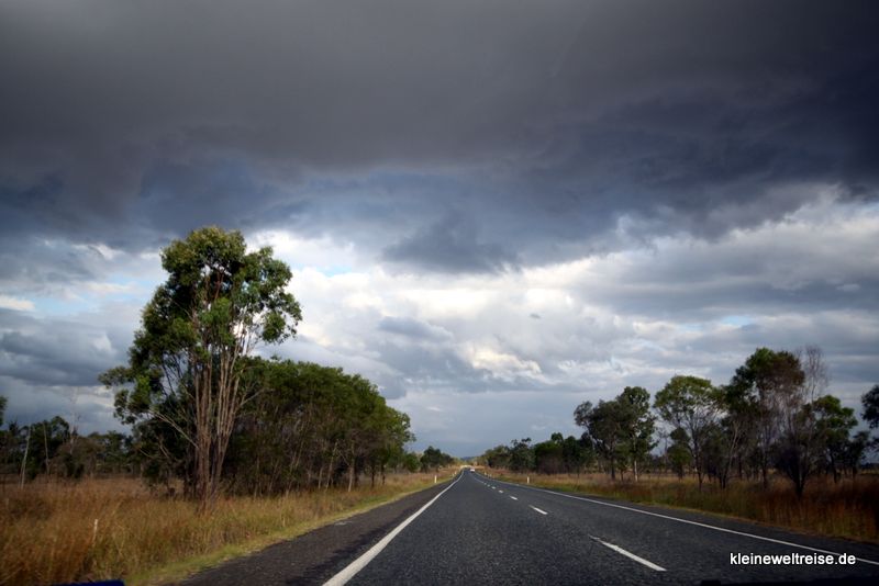 Ab Townsville hatten wir dann unser eigenes Gefährt. Einen kleinen weißen Hyundai der uns über den Bruce Highway gefahren hat. Die Straßen blieben endlos lang. Über Kilometer gab es streckenweise kein einziges Haus, nichts. Die Landschaft wechselte von tropisch zu trocken, entlang der Strecke Zuckerrohrfelder, riesige Rinderherden, tote Kängurus am Straßenrand oder Steppe mit Büschen und einzelnen Bäumen. Parallel zum Highway verliefen oft die Schienen der Eisenbahn, manchmal kamen hier anscheinend kilometerlange Güterzüge vorbei mit mehreren Locks an der Spitze und in der Mitte des Zugs.