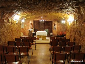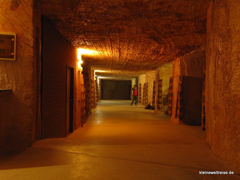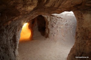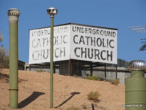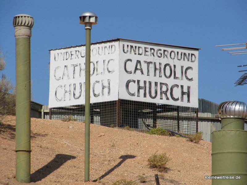 In Coober Pedy selber leben die meisten Menschen in dugouts. Das sind in den Fels gegrabene Wohnungen und Häuser. Die haben viele Vorteile: Beim Bau seines Hauses kann man Opale finden, die Temperatur ist Sommer wie Winters konstant 20-23 Grad, beim einem Sandsturm kommt der Sand nicht hinein und man hört seine Nachbarn nicht durch den Fels. In so einem dugout haben wir auch geschlafen. Irgendwie ist alles in dugouts: das lokale Museum, die katholische Kirche und Hotels.
