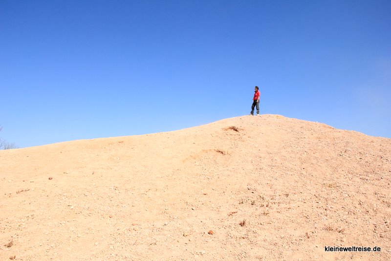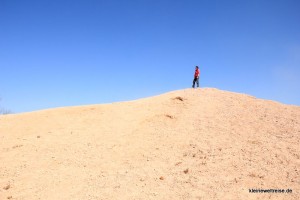 Um Coober Pedy herum gibt es viele viele Sandhügel. Hier in dieser Gegend darf man zwar graben, aber sein Loch danach nicht mehr zuschütten. Also ist alles übersät mit Löchern und eben den Sandhügeln aus dem Abraum.