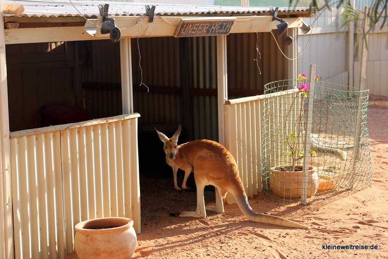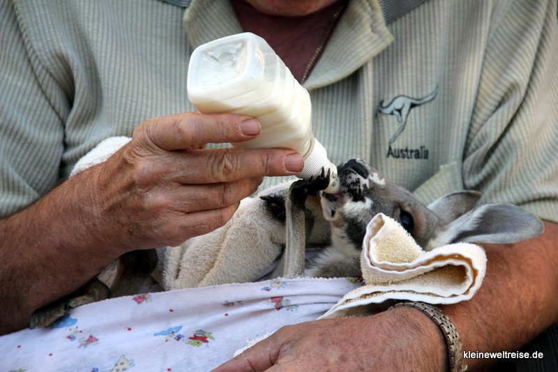 Abends waren wir in einem Kunstladen, der Aborigine Kunst, Digeridoos, Schmuck und bemalte Bumerangs verkaufte. Hinterm Haus im Garten päppelte der Shop-Betreiber Baby-Kängurus auf, die Hilfe benötigten. Einige waren angefahren worden, bei anderen war die Mutter verstorben. Ein ganz kleines wurde mit Milch gefüttert und traute sich nur wenige Schritte über den Beton. „Schau mal, der Mann hat auch einen Pelz im Gesicht, wie dein Vater“ sagte der Känguru-Helfer zum Baby und schaut auf meinen Bart. „Wenn du ihm ins Gesicht pustet und der Kleine deinen Atem mag, bekommst du vielleicht einen Kuss.“ Also pustete ich dem Känguru-Baby auf die Nase. Einmal. Zweimal. Das Dritte Mal etwas direkter. Und zum Dank bekam ich meinen ersten Känguru-Baby-Schmatzer auf den Pelz.