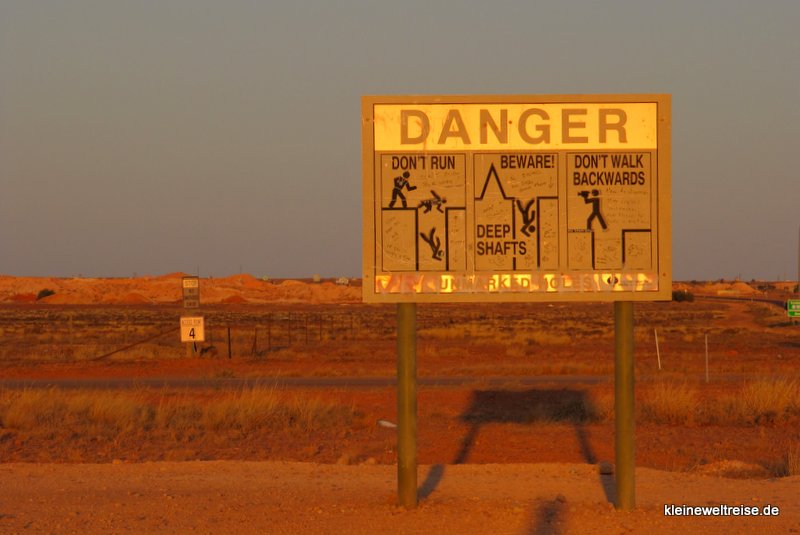 Zuerst besuchten wir eine stillgelegte Mine und das dazugehörige Museum mit Opal-Museumsshop. Im Anschluss suchten wir in einem der Abraum-Hügel nach Opalen. Manchmal fände man hier wirklich einen Guten im Wert von ein paar hundert Dollar, gab uns unser Guide Paul mit auf den Weg. Es war windig und der Sandhügel staubig, egal. Wir suchten Opale, mit den Händen durchgruben wir den Sand. Ein zwei kleine ganz nette Exemplare haben wir gefunden. Zumindest finden wir, dass sie schön aussehen. Einen Wert haben sie nämlich nicht. Schade.