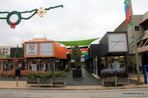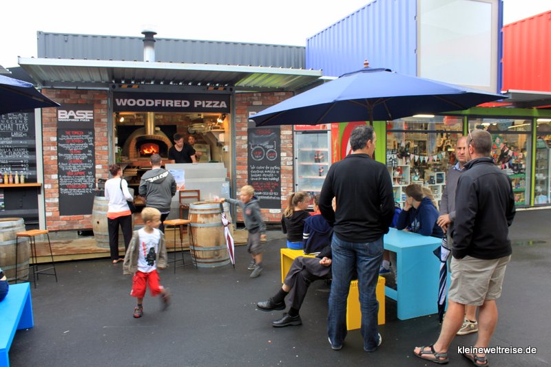Und mittendrin ein Lichtblick: Direkt an den Zäunen eine kleine Einkaufspassage aus Containern. Re:Start nennt sich diese Mall. Hier haben sich die Menschen von Christchurch nach den Beben schnell ein neues Stadtzentrum geschaffen, mit kleinen Cafés, Steinofenpizza, Banken und Shops. Allesamt in Containern!