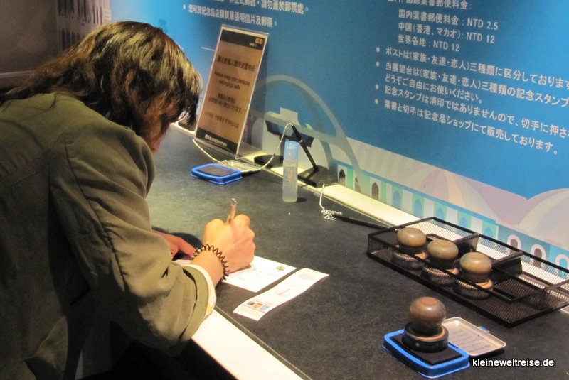 Diese Besonderheit haben wir in Taiwan entdeckt: Man liebt es, zu stempeln. An jeder Sehenswürdigkeit und in jedem Visitor Center, das etwas auf sich hält, finden wir eine Reihe Stempel und Stempelkissen. Mindestens zwei, wenn nicht mehrere Motive sind stets im Angebot. Und die Menschen kommen mit ihren Eintrittskarten, Prospekten oder eigens mitgebrachten Heften und drücken einen Stempel hinein. So sammelt man Andenken.