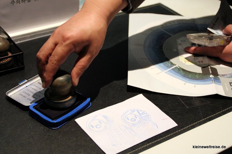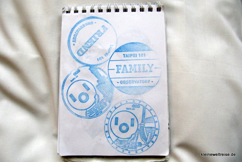 Oben auf dem Taipei 101: Der ältere Herr schiebt sich zwischen uns an den Tresen. Er packt die Übersichtskarte der Aussichtsplattform aus, faltet sie auseinander und streicht sie glatt. Nachdem er mich ein wenig beiseitegeschoben hat, greift er nach den vier Stempeln. Jeden drückt er säuberlich zuerst ins Stempelkissen und dann auf seine Übersichtskarte. So bastelt er sich ein Souvenir an seinen Ausflug auf die Aussichtsplattform.