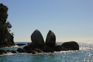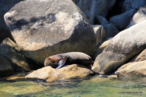 Die Bootsfahrt entlang der Küste war grandios. Erster Stopp war der Split Apple Rock. Ein Stein, der aussieht wie ein geteilter Apfel. Wir fuhren an Seehundkolonien vorbei und beinahe hätte ich die süßen Robben verpasst. Diese Tiere sind nämlich so schwer auf den Felsen auszumachen, einfach weil sie mit ihrem braunen Fell selber wie ein Stück Fels aussehen. Der kleine Pinguin, der nicht weit von uns im Wasser schwamm, war da leichter zu entdecken. Weiter ging es entlang der Granitfelsen und der zahlreichen Traumstrände mit dem goldgelben Sand. Immer wieder setzte das Wassertaxi jetzt Wanderer aus, die sich auf ihren Weg durch den Wald und die Buchten machten.