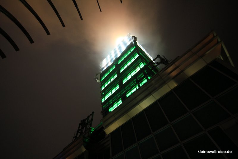 Wir kamen mit dem kostenlosen Shuttlebus von der City-Hall-U-Bahn an und standen direkt inmitten einer Luxus-Mall wieder, die den Luxusmeilen in Hongkong um nichts nachstand. Wir schlurften über den weißen Marmorboden, bis wir endlich hinter Prada und Luis Vitton die kleine Rolltreppe fanden. Sie führte zum schnellsten Aufzug der Welt (Guinness Weltrekord). Mit dem rasten wir mit 60 Sachen in den 89. Stock. Der Tag war nebelig-schön, die Plattform war kurz unter der Wolkendecke. Immer wieder zogen Wolken vorbei und umhüllten kurz die Spitze des Turms.