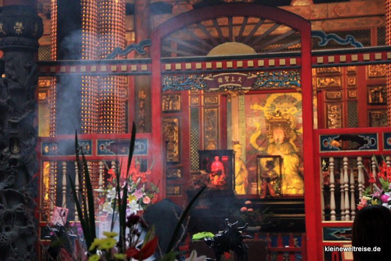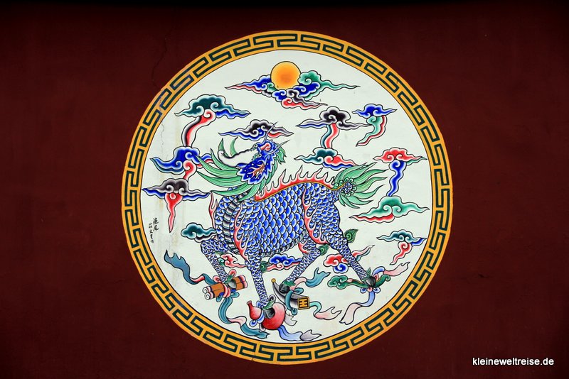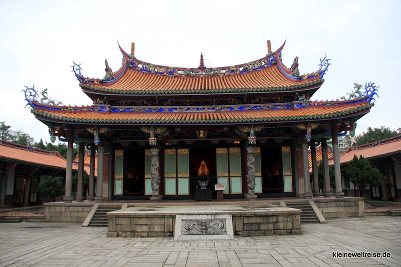 In dieser Anlage aus sechs Gebäuden wird der chinesische Gelehrte Konfuzius verehrt. Das Schöne hier war: Es war relativ ruhig und menschenleer. Wir genossen die Ruhe am Halbmondteich und hatten viel Zeit, die zahlreichen Verzierungen des Tempels in Ruhe anzuschauen. Nur ab und zu wurde die Stille unterbrochen von einem Flugzeug, das im Tiefflug zur Landung auf dem nahen Flughafen ansetzte. Der Konfuzius-Tempel ist der einzige Tempel in Taipeh mit den Keramikverzierungen im südlichen Fujian-Stil.