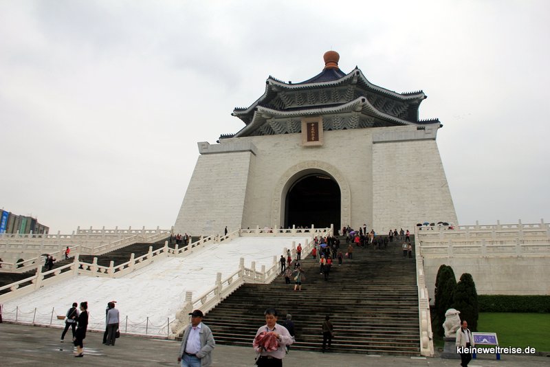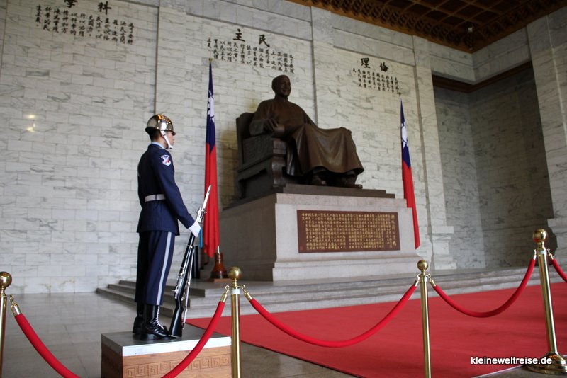 Schon der riesige Platz davor war trotz des Regens ziemlich mächtig und repräsentativ: Auf der einen Seite das National Theater (schöne alte chinesische Bauweise), gegenüber die National Concert Hall (ebenfalls sehr chinesisch gebaut) und am Ende des langen Platzes auf dem Berg die Nationale Chiang-Kai-Shek-Gedächtnishalle mit ihrem blauen Dach. Innen thronte der CKS (wie er abgekürzt wird) in Übergröße, links und rechts zwei wie aus dem Ei gepellte Wachen. Ein wenig erinnerte uns das an das Lincoln Memorial. So muss es wohl aussehen, wenn Länder ihren alten Führern Denkmal-Hallen bauen.