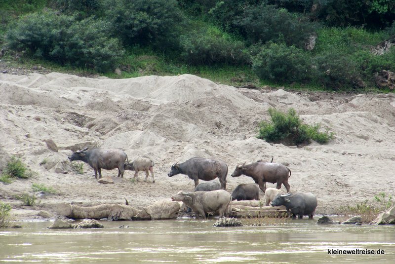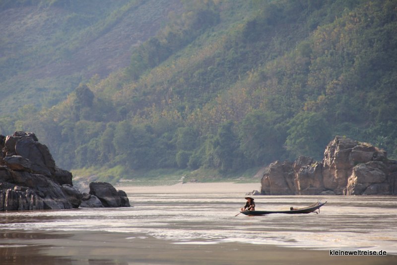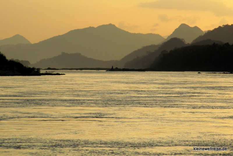 Das Schiff fuhr langsam stromabwärts. Am Ufer sahen wir den Regenwald, Wasserbüffel, Fischer und Leute die nach Gold schürften. Felsen und Formationen aus Kalkstein zogen sich entlang des Ufers und ragten manchmal bis in die Fahrrinne hinein. Wir hatten einen ganzen Tag lang Zeit, um einfach die Aussicht zu genießen, zu chillen, lesen oder mit den Mitreisenden zu quatschen. Der Tag verging, und kurz vor unserem Ziel sank die Sonne, wurde erst Orange und dann Rot und ging über dem Mekong unter.