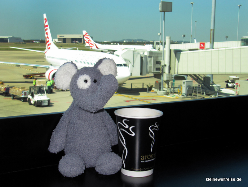 Fanta nimmt morgens am Flughafen von Brisbane einen KaffeeBegleitet wurden wir auf Reisen von Fanta, der Sockenpuppe. Fanta ist ein neugieriger und manchmal ein wenig chaotischer kleiner Kerl mit einem ganz großen Herzen. Durch ihn bekam unsere Reise immer wieder einen kleinen spannenden Schwung. Fantas liebste Fotos von der Reise sind hier gesammelt.