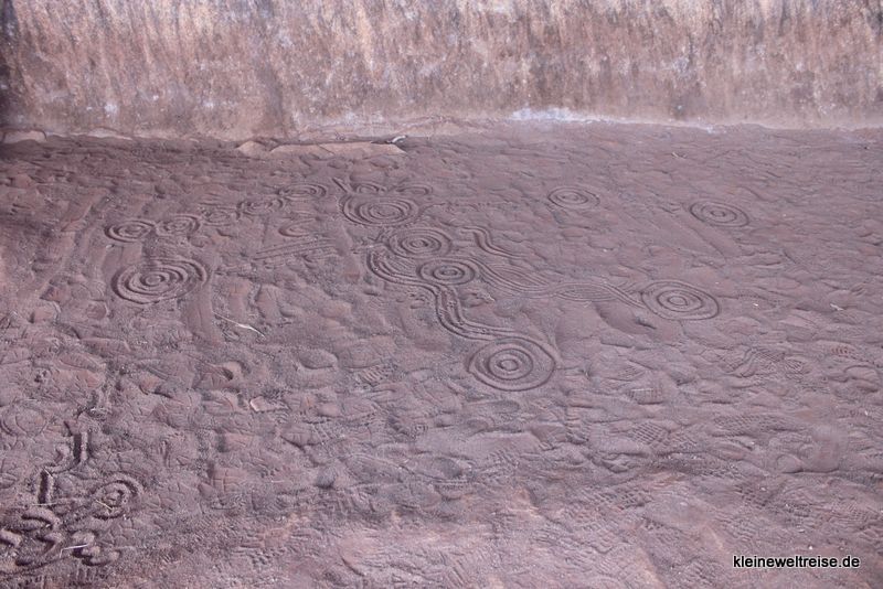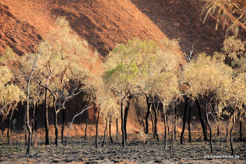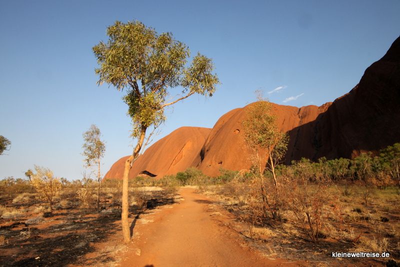 Früh morgens um 7 Uhr, die Sonne ist bereits aufgegangen, machen wir uns auf den Weg um den Uluru, wie der Ayers Rock von den Aborigines genannt wird. Es gibt um den ganzen Fels herum einen Base Walk, der etwa drei Stunden dauert. Aus eigener Erfahrung würde ich immer empfehlen, früh morgens hier entlang zu laufen, sonst wird es einfach zu heiß. Wir gehen den halben Base Walk. Aus der Nähe wirkt der Uluru immer noch groß, aber man sieht jetzt die vielen Einkerbungen, Höhlen und Spuren von Wind und Wetter. Ab und zu ist die Erde verbrannt und einzelne Bäume stehen noch. Wir kommen an ein Wasserloch, der Sage nach haben sich hier zwei Schlangen (die Gute und die Böse) bekämpft. In den Höhlen entlang des Uluru finden wir Aborigine Kunst, Wissen über den Fels, das Land und das Überleben im Outback welches von Generation zu Generation weitergegeben wurde. Keiner weiß genau, wie alt diese Zeichnungen sind, vielleicht 500 Jahre, 1.000 Jahre oder 15.000 Jahre. Einige dieser Höhlen dienten den Ureinwohnern Australiens als Schule. Hier haben Großväter ihren Söhnen das Wissen welches sie benötigten weitergegeben. In einer dieser Höhlen erzählte uns unser Guide Vincent, ein Aborigine, die Entstehungsgeschichte des Landes und zeichnete sie auf den Boden. Wahnsinnig spannend.