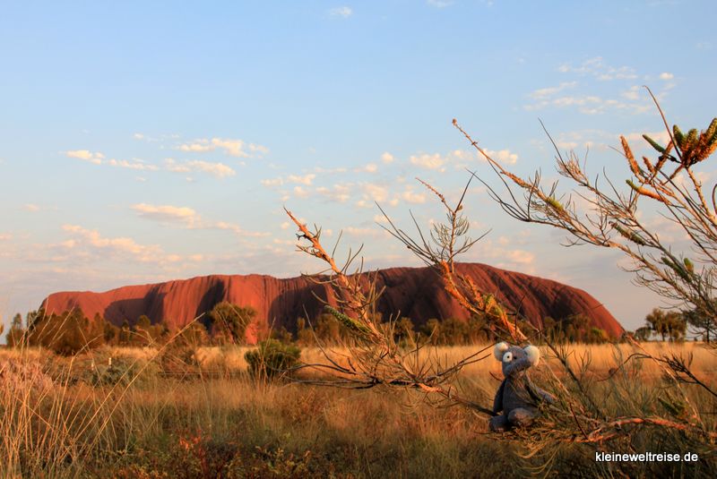 Zum Dinner gibt es ein echtes australisches BBQ im Busch mit Känguru, Beef und Kamelwurst. Zum Nachtisch darf Fanta seine ersten Marshmallows an einem Stock über dem Lagerfeuer rösten. Auch um Mitternacht sind es noch 30 Grad. Nach nur wenigen Stunden stehen wir um „stupid o’clock“ wieder auf und fahren zum Felsen. Es dämmert noch und endlich ist die Temperatur angenehm. Wieder ein Parkplatz mit Bussen und eine Aussichtsplattform. Und dann werden die kleinen Schäfchenwolken über dem Ayers Rock rot und nach und nach fängt der ganze Fels an zu glühen im Licht der aufgehenden Sonne. Wahnsinnig schön und magisch.